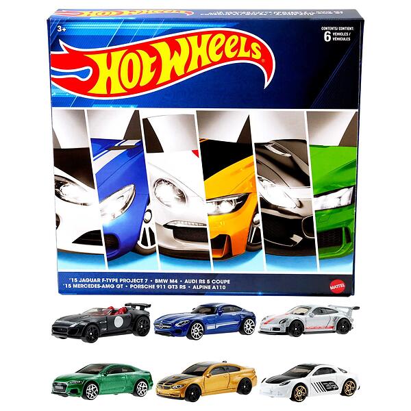 European Car Culture Multipacks of 6 Premium Toy Cars, 1:64 Scale, Authentic Decos, Popular Castings, Rolling Wheels, Gift for Kids 3+ & Collectors